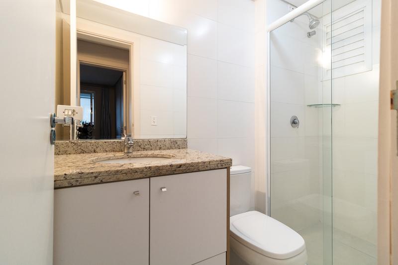 * Dois banheiros, sendo um social e um suíte, ambos com armários, espelhos, box e chuveiro (elétrico na suíte e a gás no social).