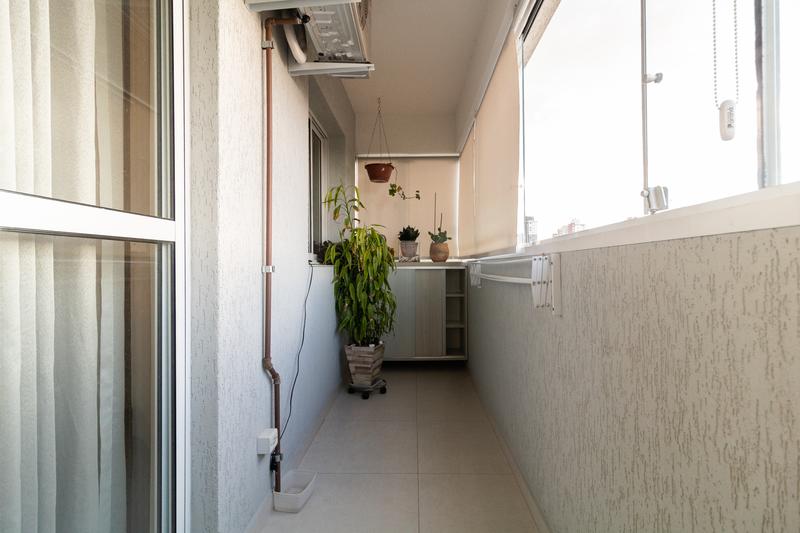 * Sacada com churrasqueira, tampo frontal, cortina corta-sol e piso porcelanato.
