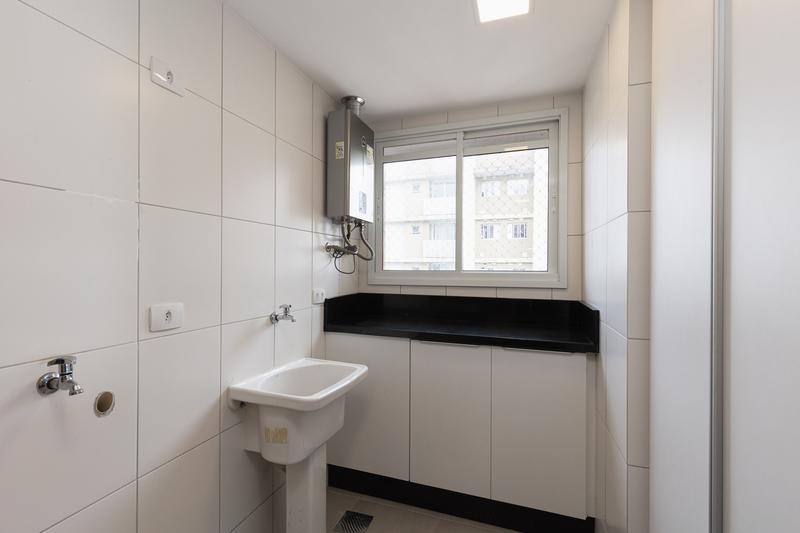 Área de serviço funcional, com armários, balcão e central de gás.