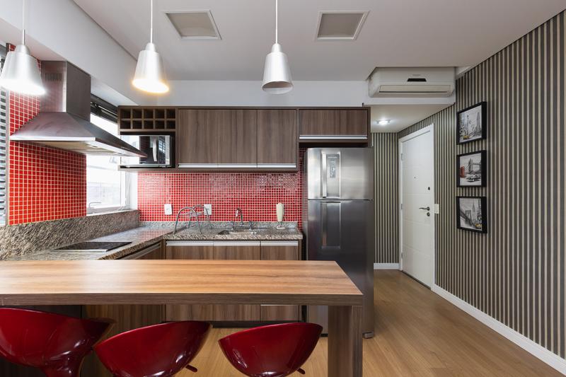 Cozinha moderna com pia, armários planejados, cooktop de indução, geladeira, micro-ondas, balcão com banquetas e luminárias suspensas.