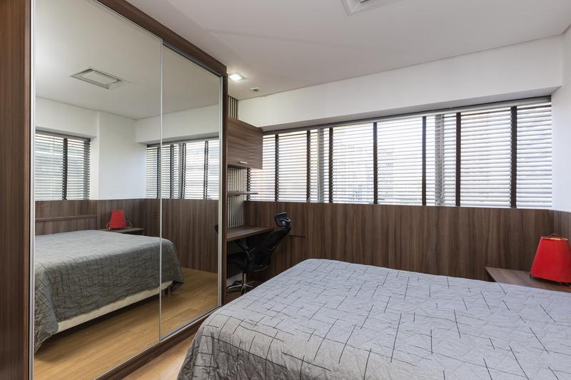 Quarto mobiliado com armário, cama de casal, mesa de escritório e cadeira, pronto para atender conforto e funcionalidade.