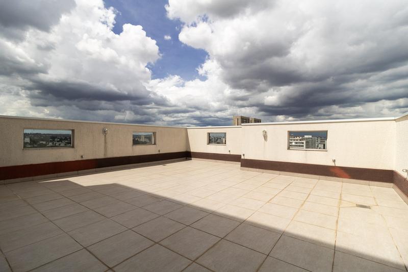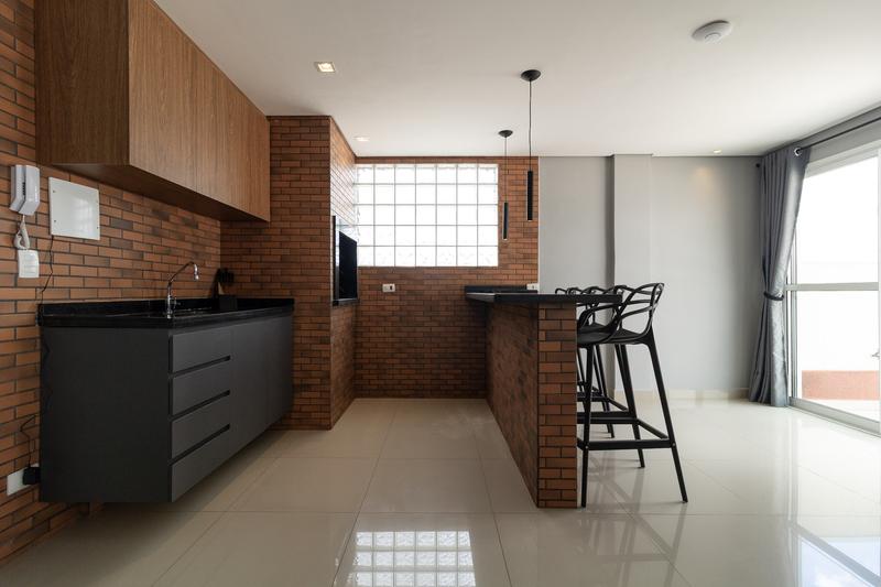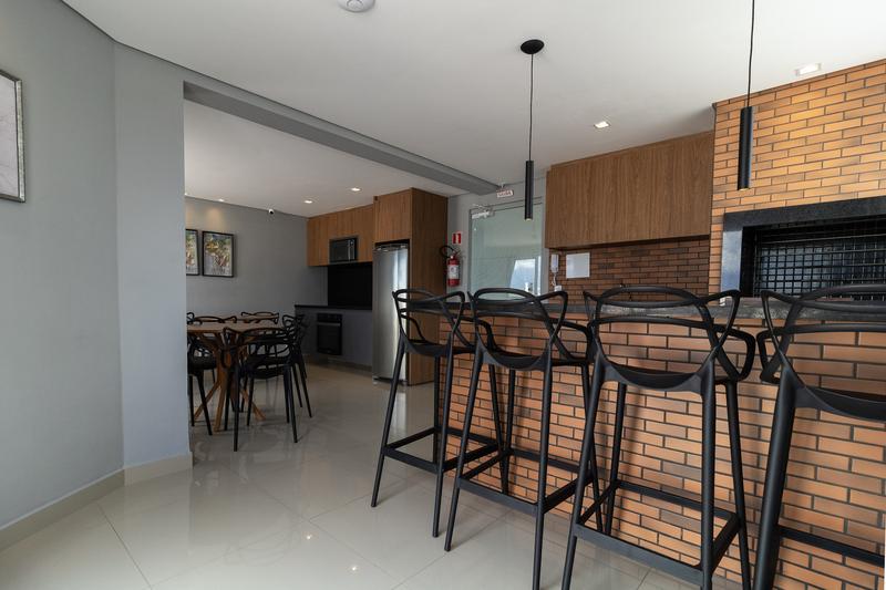 Salão de festas completo no terraço com churrasqueira e vista panorâmica
