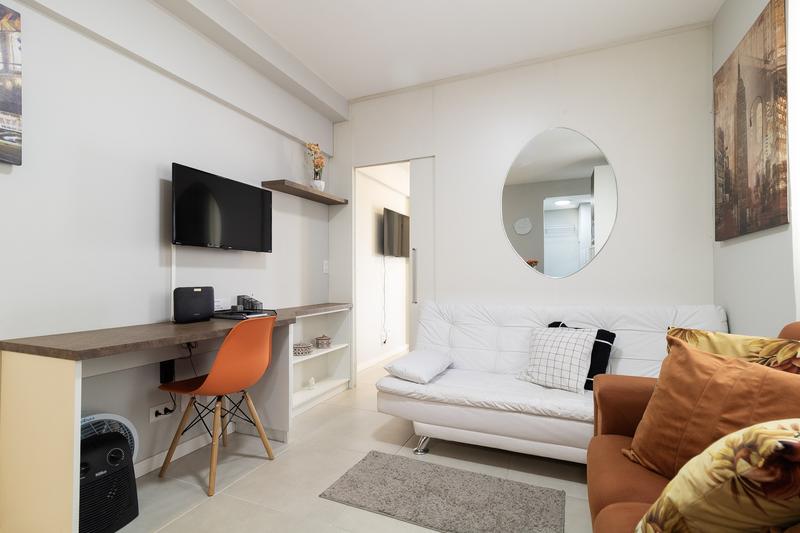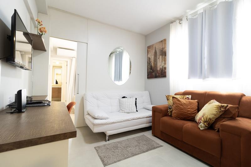 01 Sala completa equipada com dois sofás televisão led escrivaninha e internet inclusa