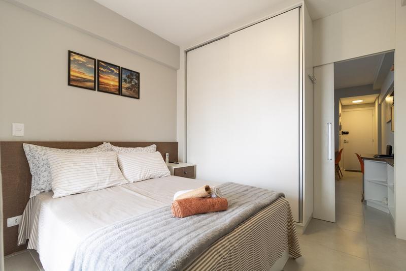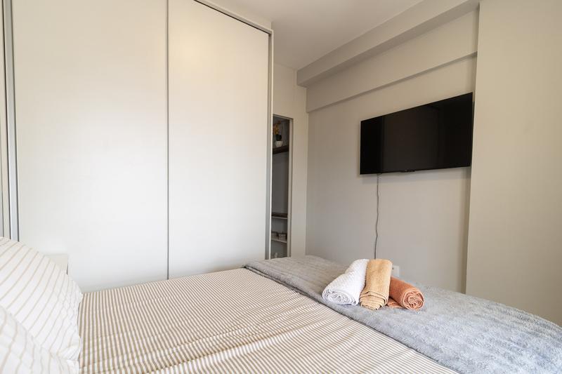 01 Dormitório mobiliado com ar condicionado cama de casal e televisão de grandes dimensões