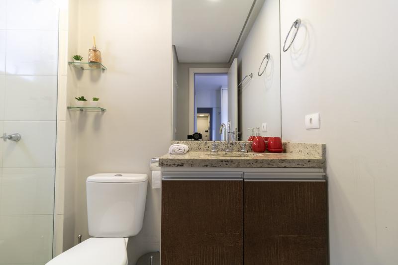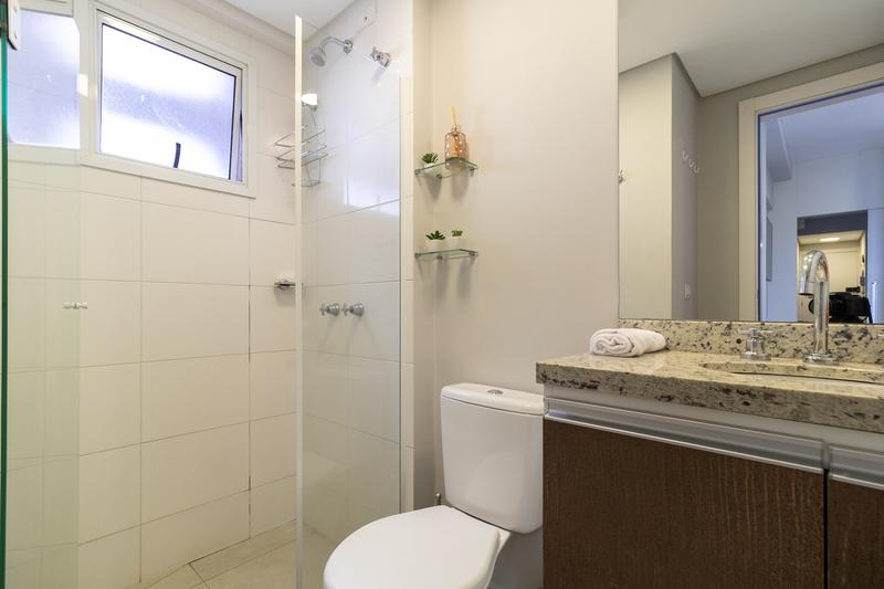 01 Banheiro funcional com box em vidro pia em granito e água quente via caldeira