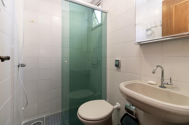 01 Banheiro equipado com espelho e box de vidro, oferecendo funcionalidade no dia a dia.
