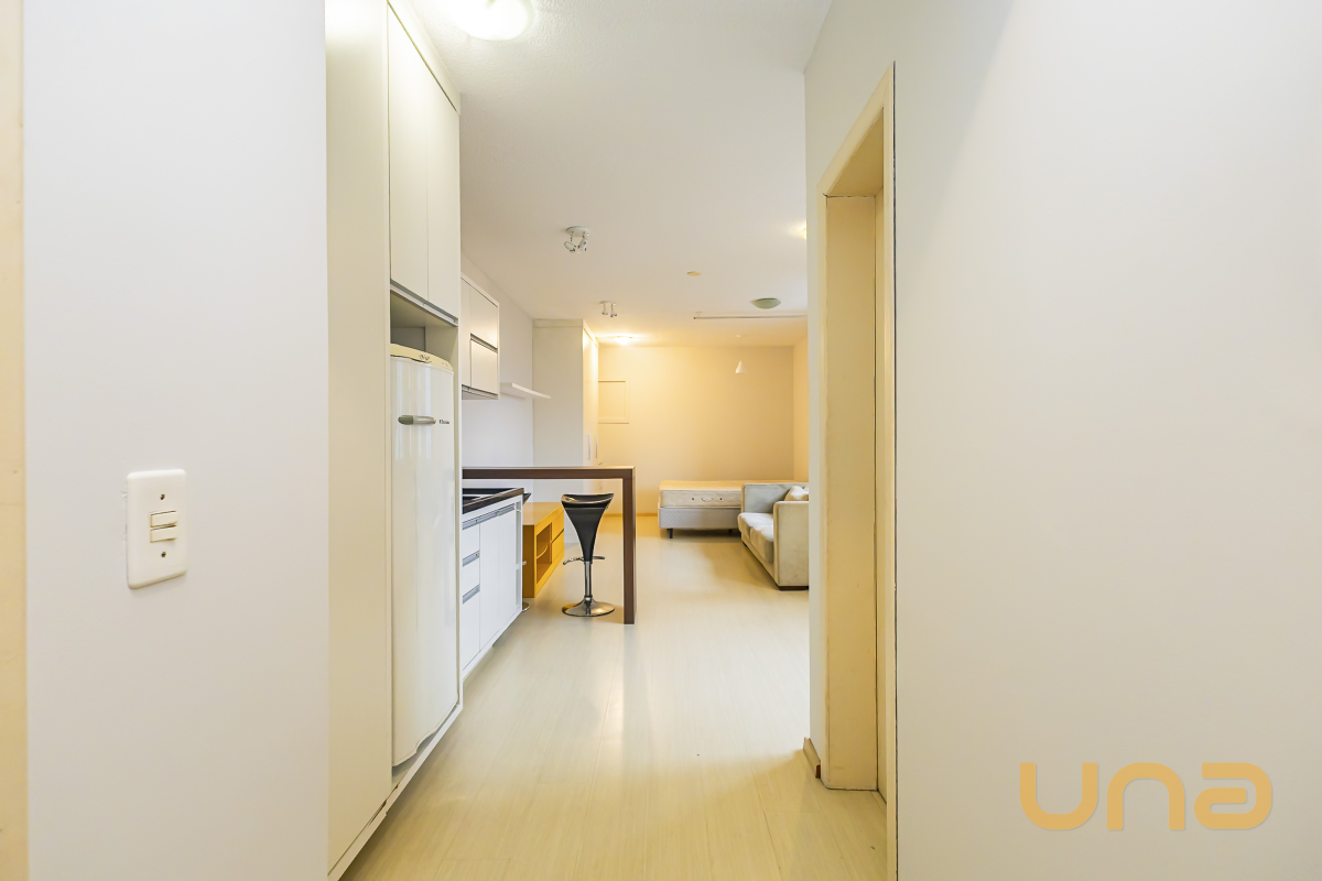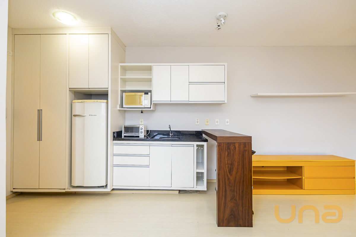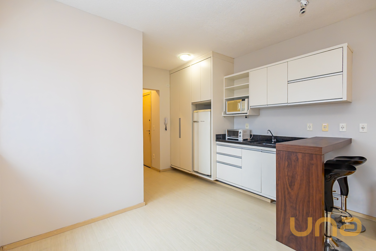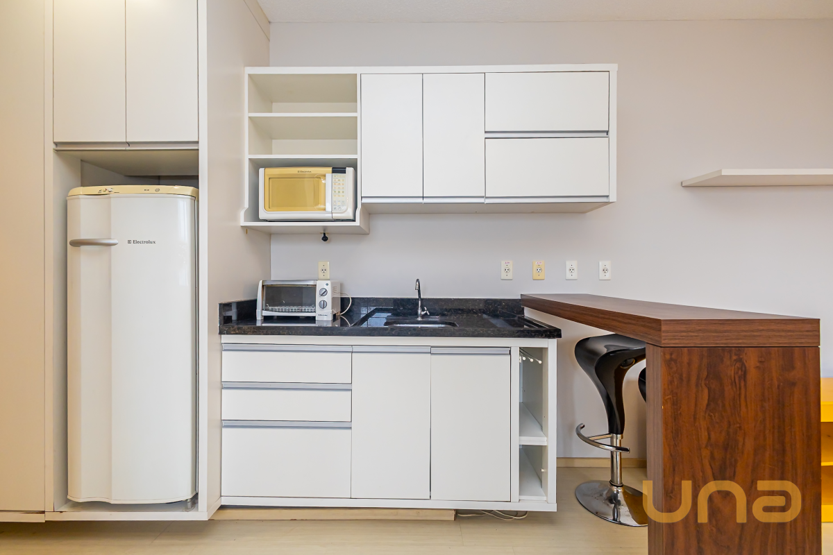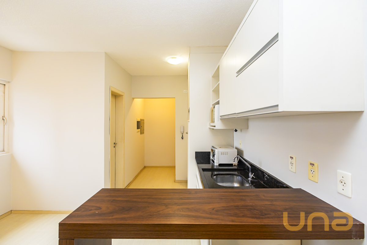 Cozinha com armário, banheiro com box blindex, piso laminado.