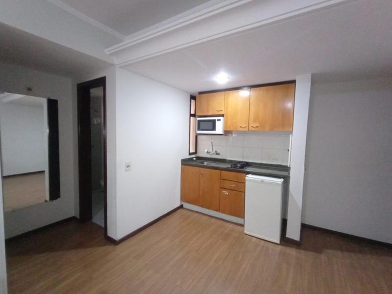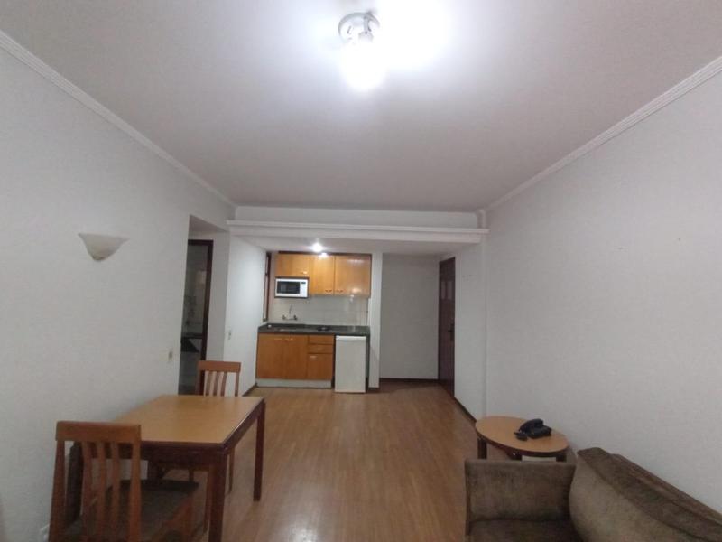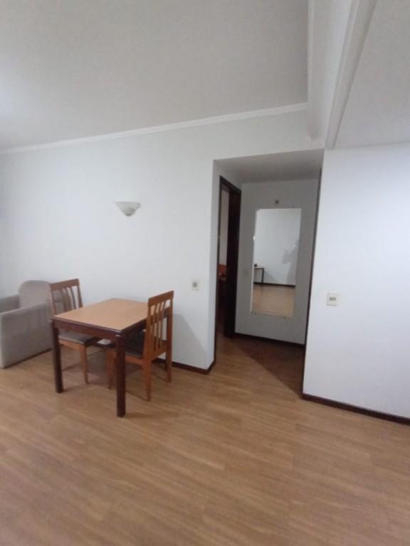 Sala e cozinha conjugadas, com sofá, mesa e 02 cadeiras, frigobar, microondas e ar condicionado