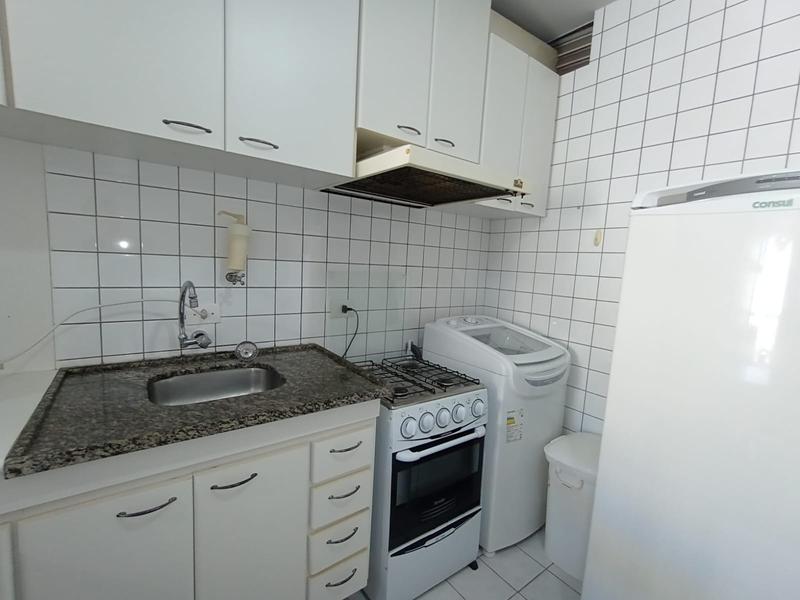 * Cozinha com armários, fogão, geladeira e micro-ondas.