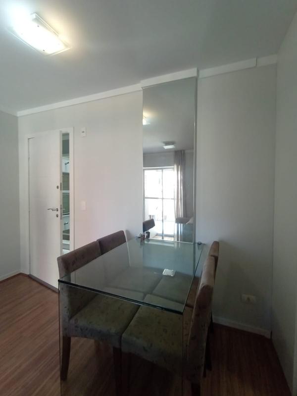 * Sala para 2 ambientes, com mesa de vidro com 4 cadeiras, sofá de 3 lugares, rack e TV.