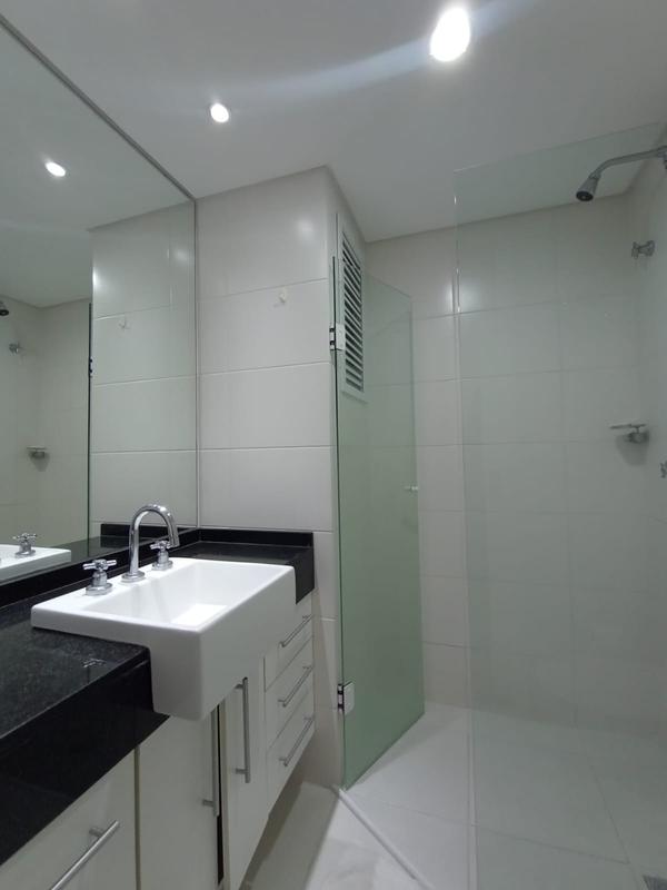 * 1 banheiro social com box em vidro, chuveiro e ducha, pia com bancada em granito e espelho;
