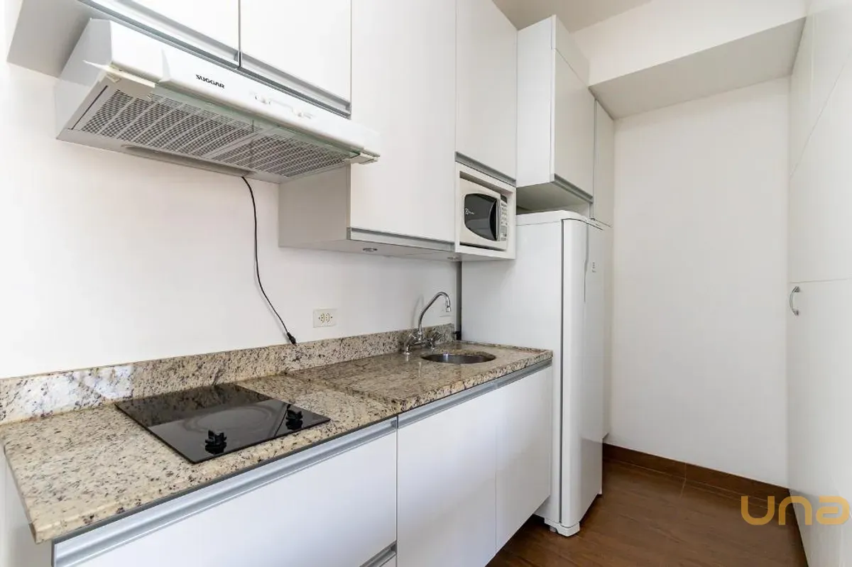 º Cozinha com fogão cooktop, microondas, geladeira, exaustor e mesa para copa