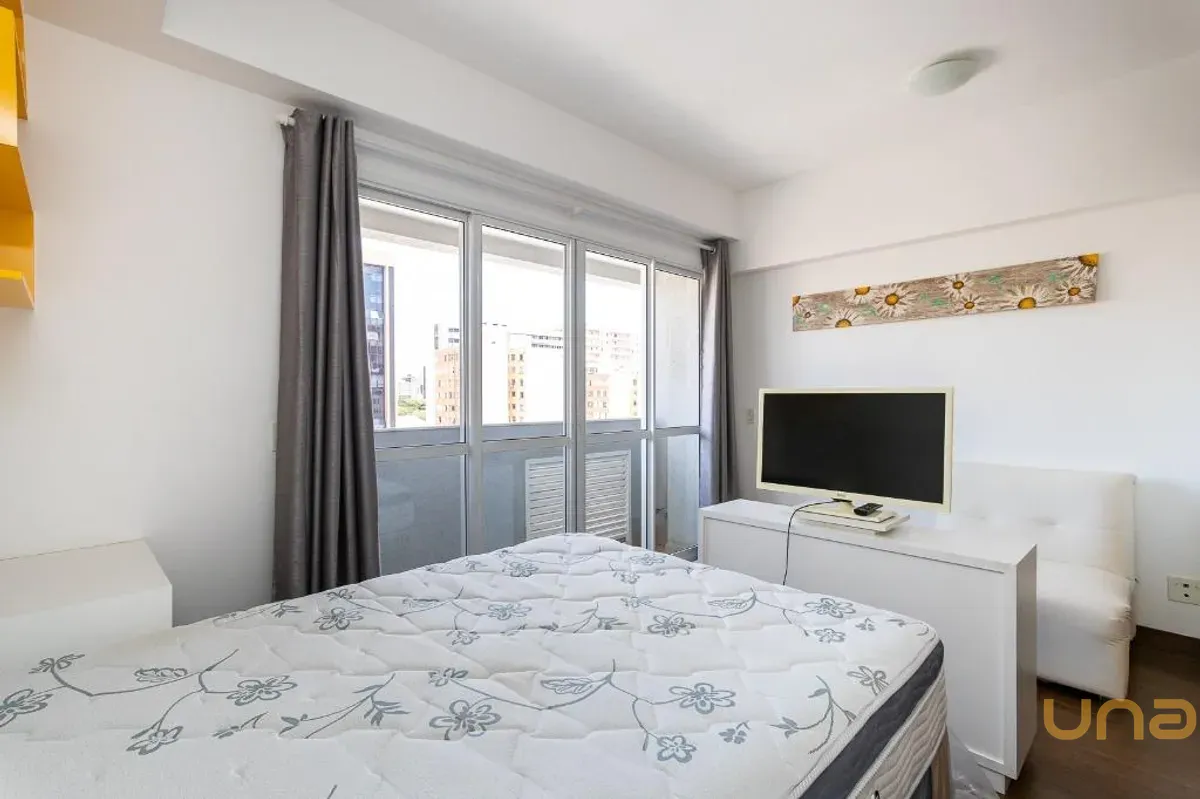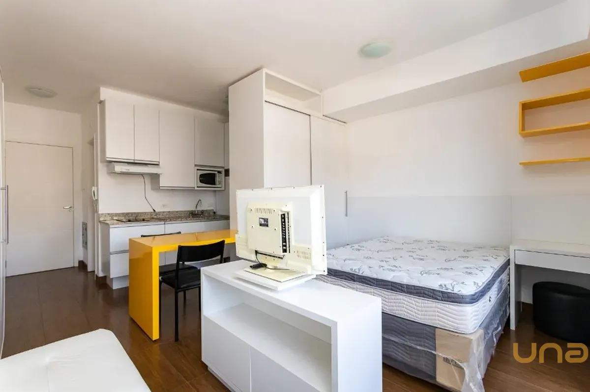 º Sala/quarto com sofá, cama box, guarda-roupas e TV