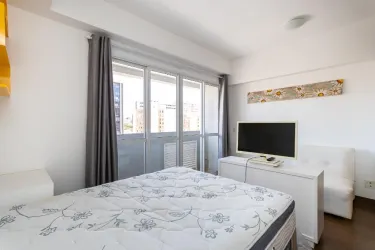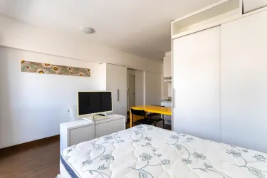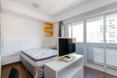 º Sala/quarto com sofá, cama box, guarda-roupas e TV
