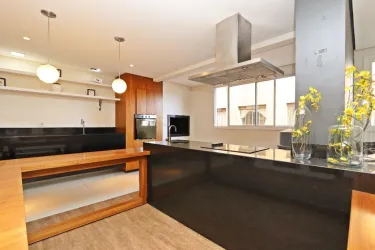 º Cozinha com fogão cooktop, microondas, geladeira, exaustor e mesa para copa