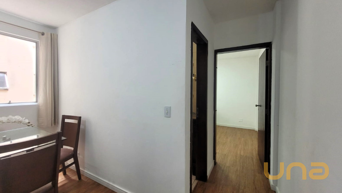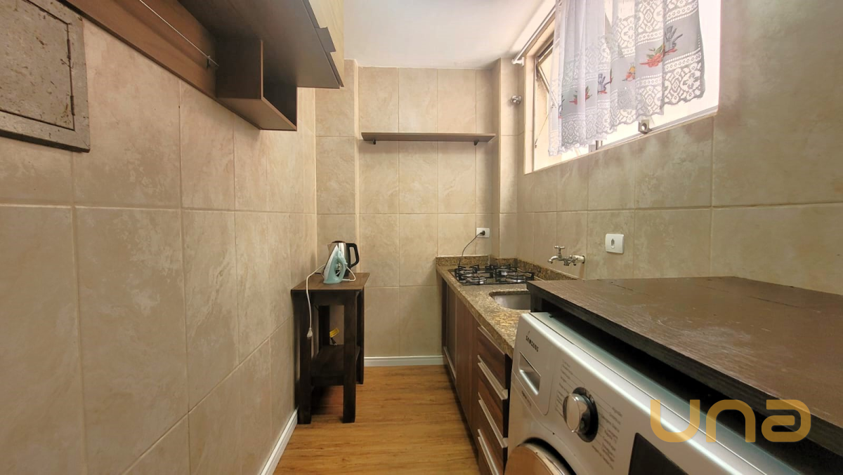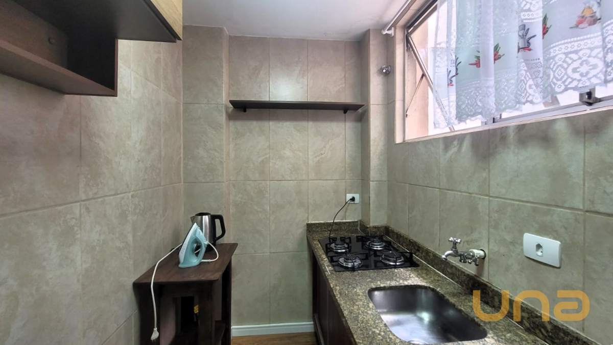 O imóvel possui 1 quarto com cama de casal, sala com sofá e mesa com quatro cadeira, cozinha e banheiro social com box de vidro e ventilação natural (janela).