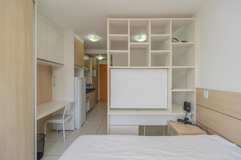 O studio conta com planta funcional e ambientes integrados, otimizando o espaço e proporcionando mais comodidade no dia a dia.