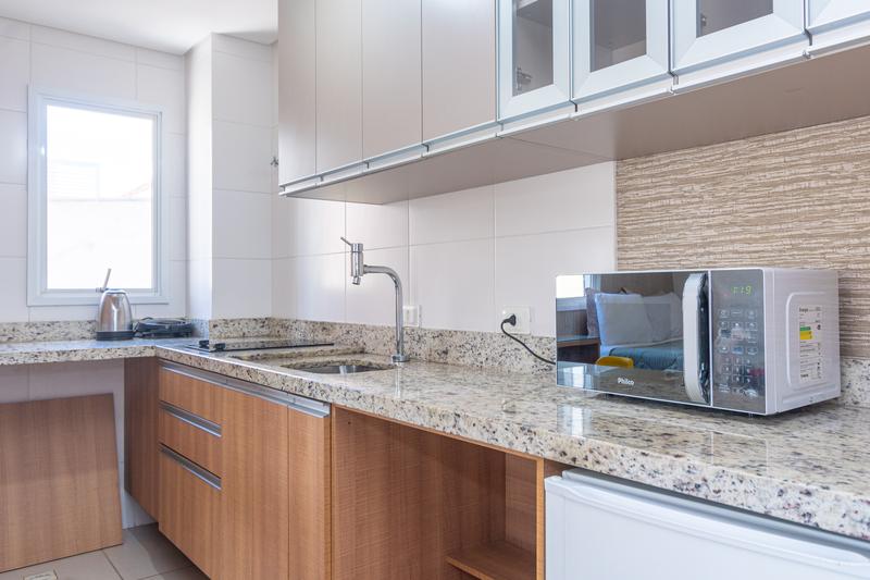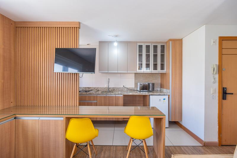 Imóvel totalmente mobiliado, com cama, sofá, TV e eletrodomésticos, oferecendo praticidade e conforto.