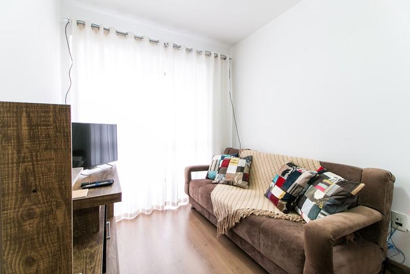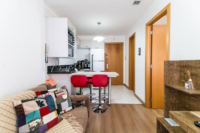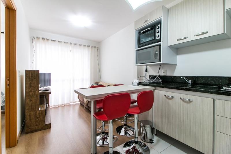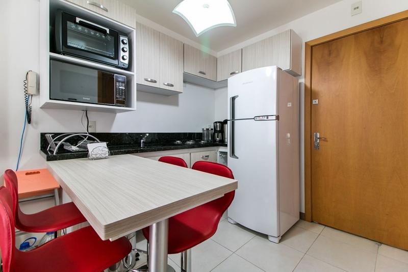 O imóvel encontra-se integralmente mobiliado e equipado, oferecendo praticidade e conforto. Sala de estar mobiliada com sofá e rack, sacada com churrasqueira a gás, porta de vidro deslizante e varal. Possui dormitório com armário planejado, cama box de casal e espelho de grandes dimensões, banheiro social com pía, gabinete e box em vidro temperado e cozinha integrada e equipada com balcão, pia, cooktop, refrigerador, armários, bancada com quatro cadeiras, utensílios de cozinha e liquidificador.