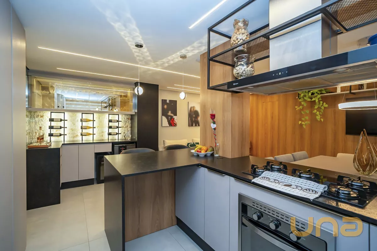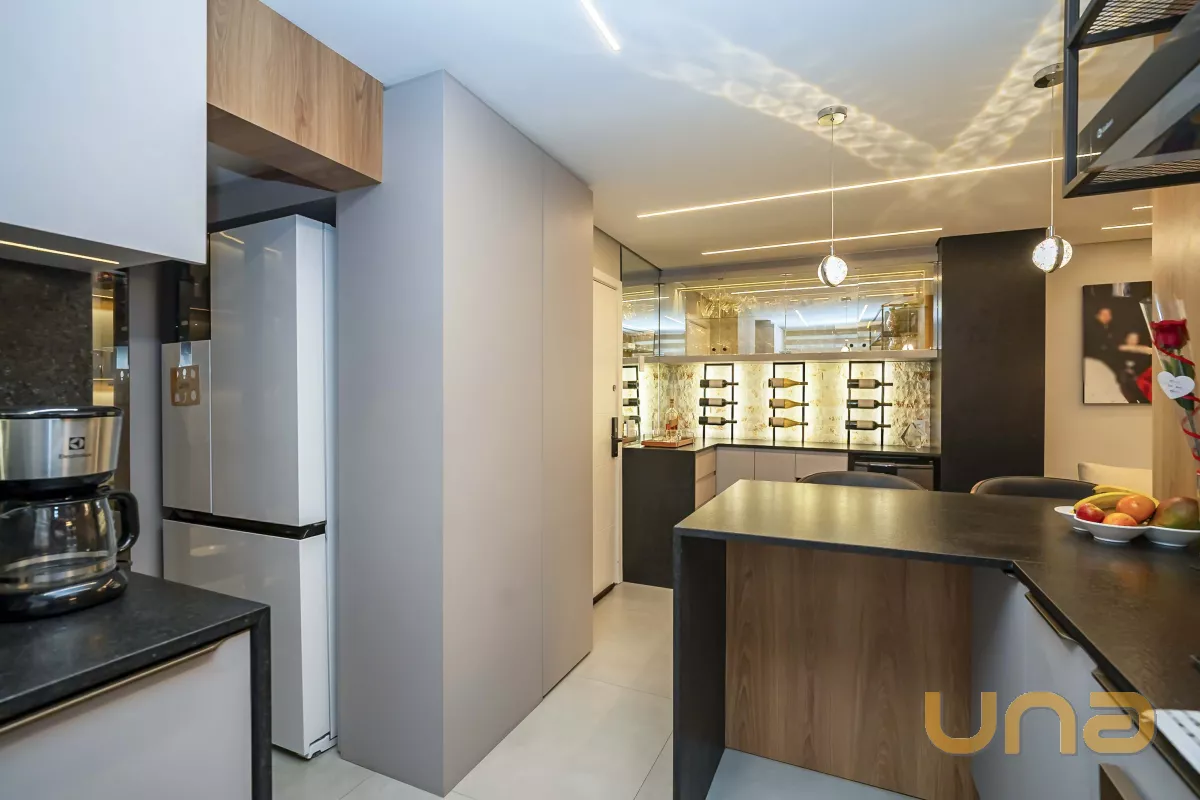 A cozinha planejada se integra perfeitamente à área social, com excelente aproveitamento de espaço e materiais de alta qualidade. Para os apreciadores de vinho, o apartamento conta com uma adega climatizada incorporada ao layout com elegância e discrição.