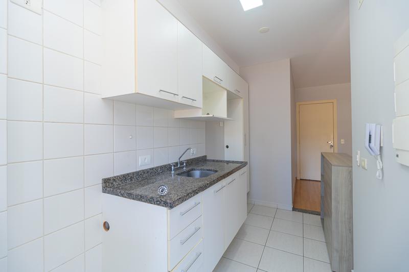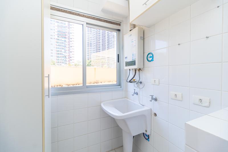 O imóvel conta com sala ampla e bem iluminada para dois ambientes, com acesso à sacada. A cozinha possui armários planejados e é integrada à área de serviço, oferecendo mais praticidade no dia a dia.