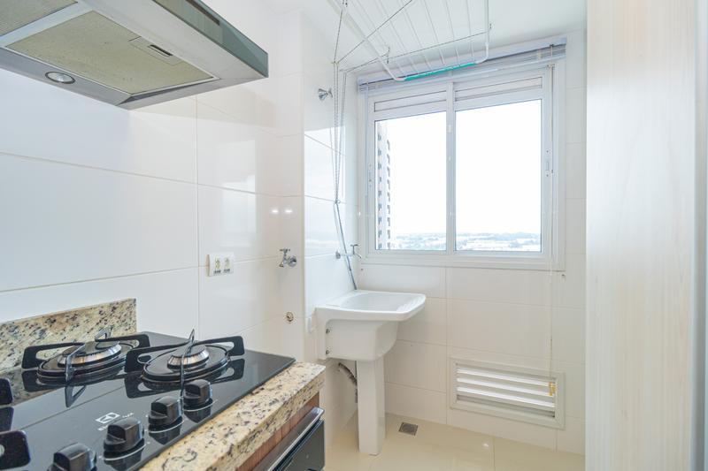 – Varanda em complemento com a sala, com piso em cerâmica, fechada em vidro