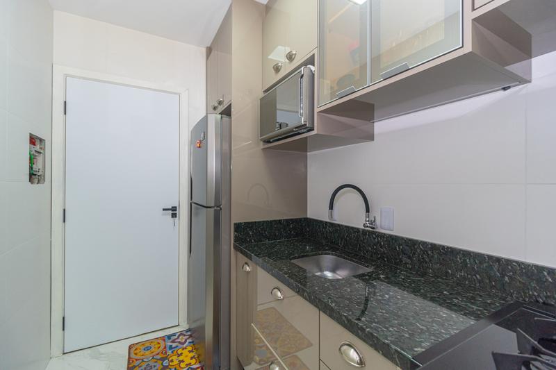 – Cozinha com armários planejados, possui geladeira, fogão e micro-ondas,