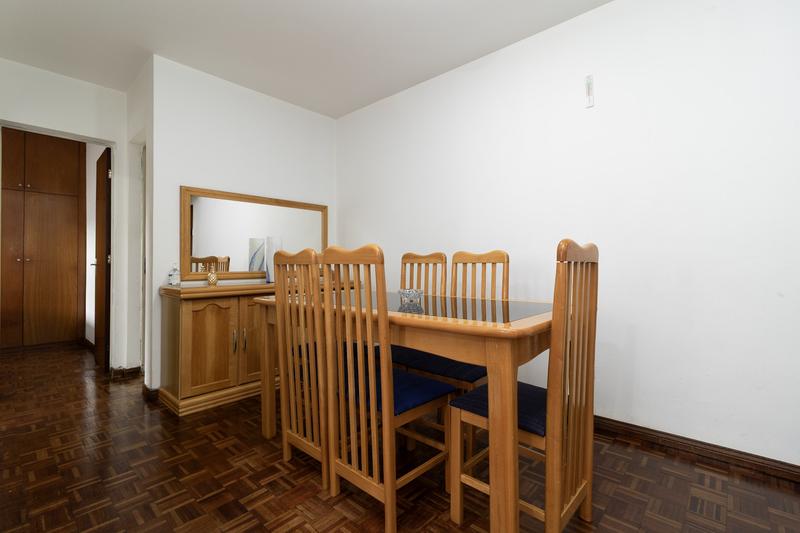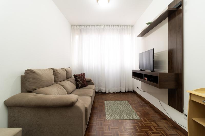 Sala ampla para dois ambientes, já mobiliada com sofá, puff, mesa com cadeiras, rack, painel, TV, interfone, cortinas, luminárias e espelho de parede, além de tela de proteção nas janelas. Piso parquet preservado e excelente aproveitamento de espaço.
