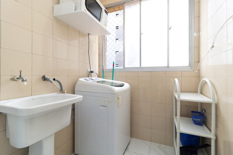 Área de serviço completa, com tanque, máquina de lavar roupas, varal, prateleira de piso e tela de proteção nas janelas.