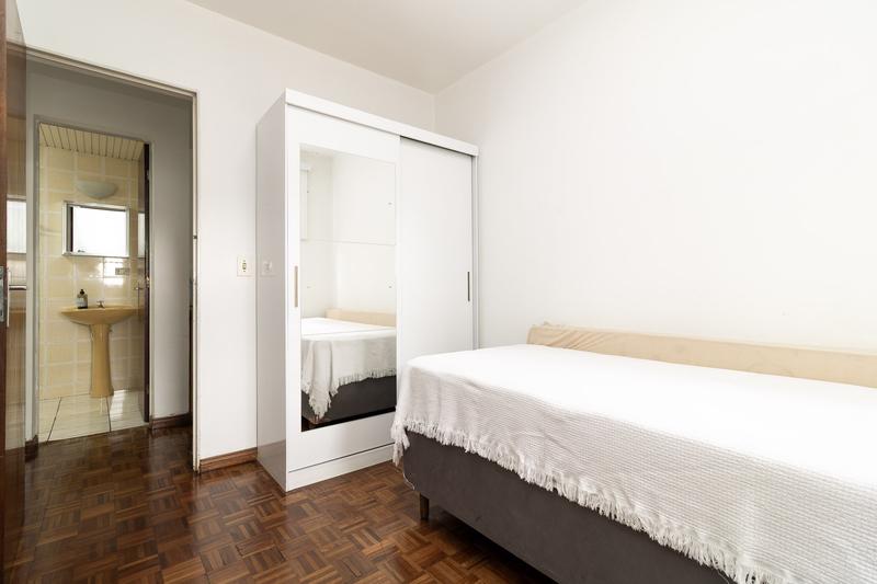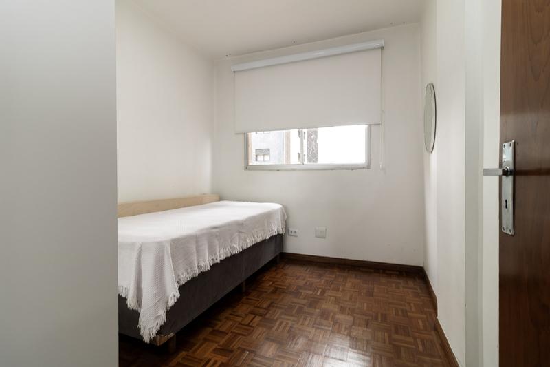 – Dormitório II: cama de solteiro, armário embutido, piso parquet, cortina e tela de proteção.