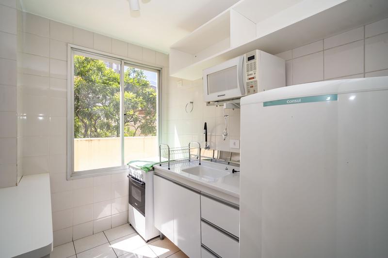 Cozinha equipada com armários, fogão e geladeira, porta de correr,