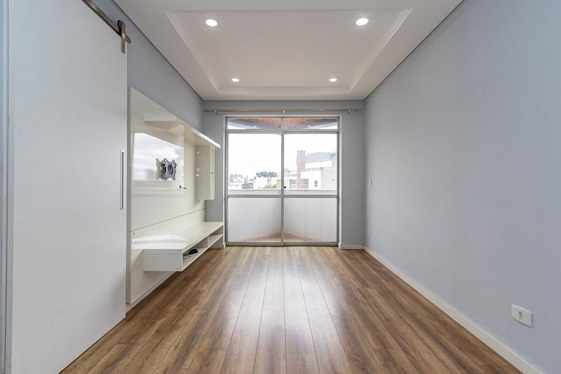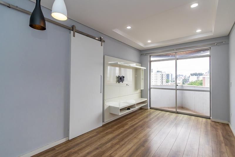 Sala com painel laqueado, teto rebaixado em gesso, luminárias modernas, ambiente amplo e claro,