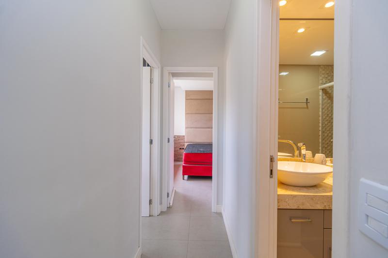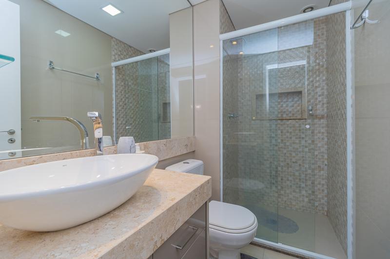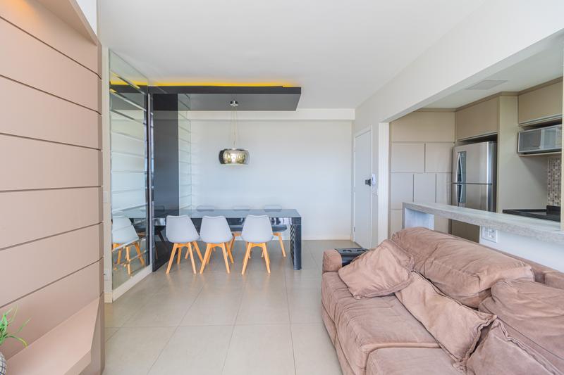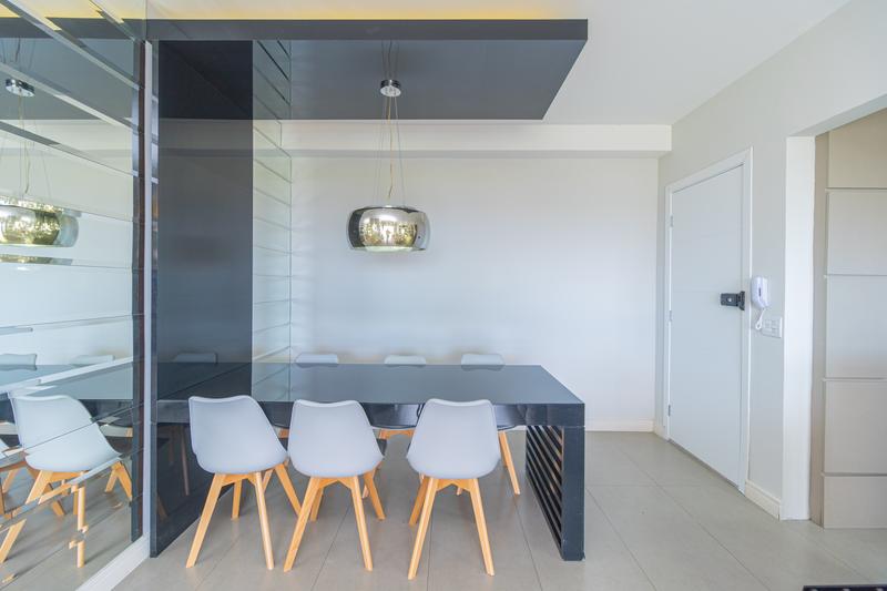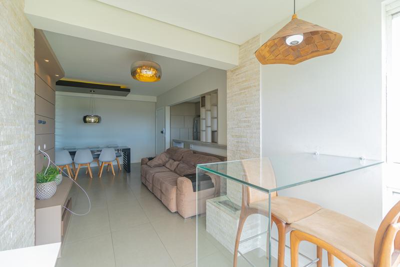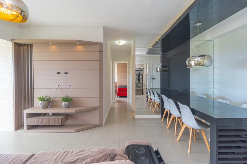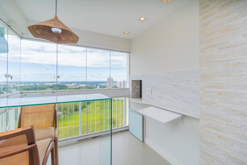 – Sala ampla para dois ambientes integrados e projetados com uma mesa embutida de 6 lugares, sofá, rack e painel para TV, lareira ecológica, sacada integrada com mesa em vidro e 2 banquetas altas, churrasqueira e fechamento em vidro sistema reiki;