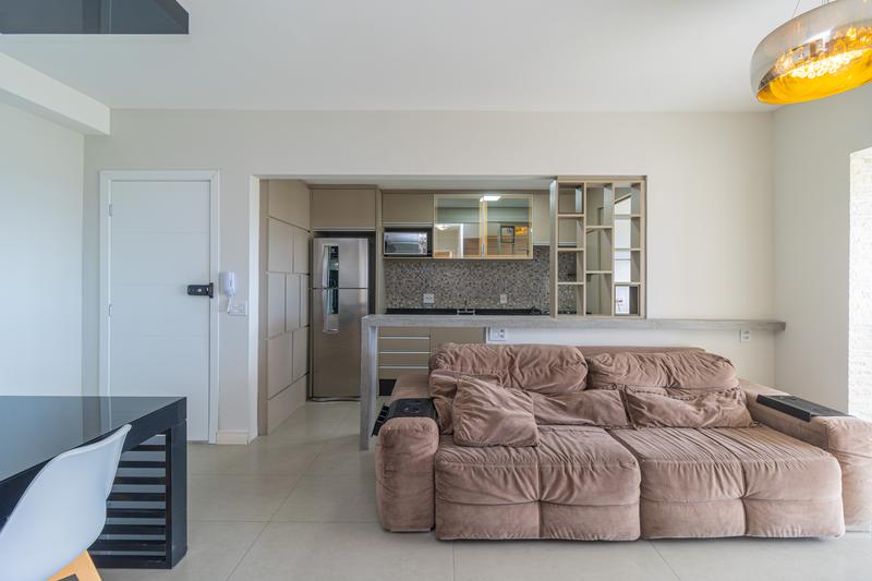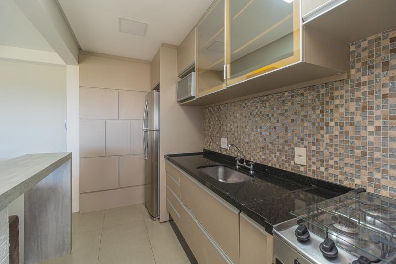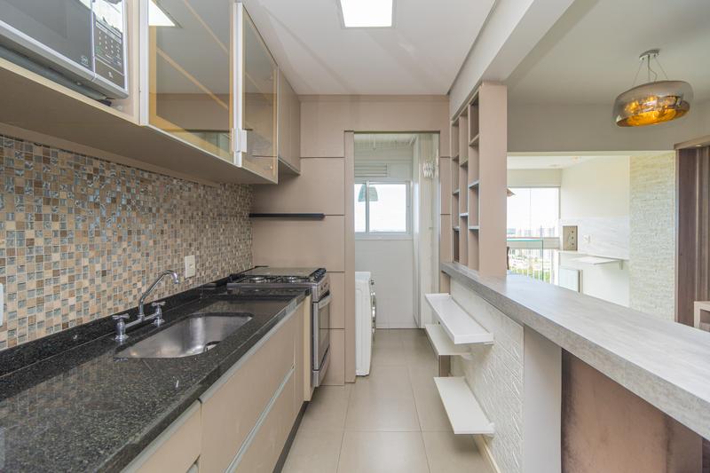 – Cozinha em conceito aberto com armários planejados, geladeira, fogão, micro-ondas e um passa pratos com 1 banqueta;