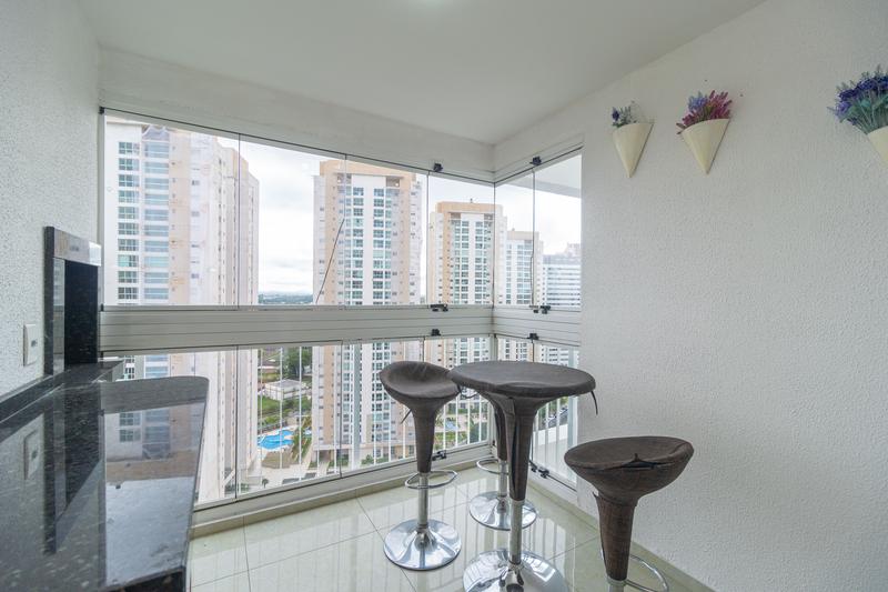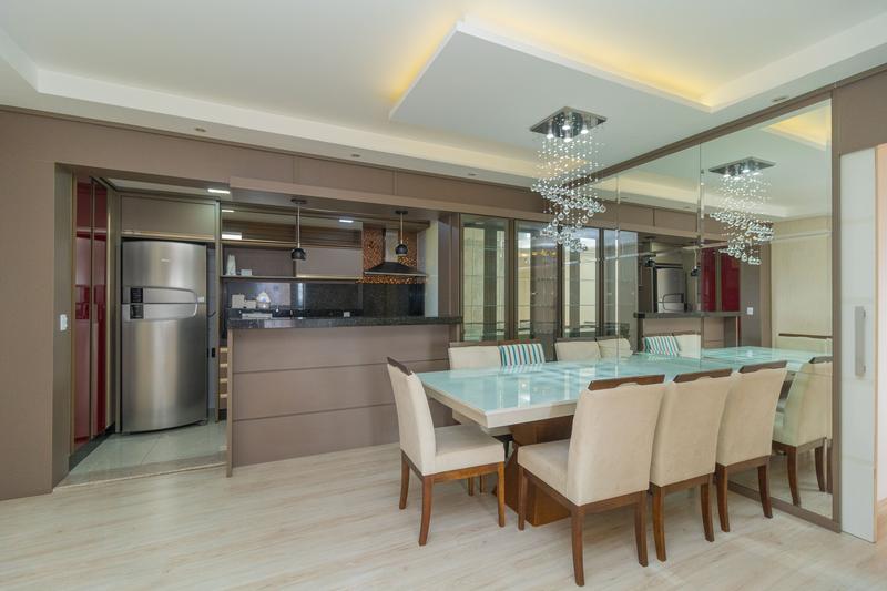 A área social conta com sala ampla para dois ambientes, com detalhes em parede espelhada, papel de parede em alto relevo e iluminação em LED, proporcionando um ambiente sofisticado e aconchegante. O espaço é integrado à sacada com fechamento em vidro (sistema Reiki) e churrasqueira, criando um ambiente ideal para convivência.