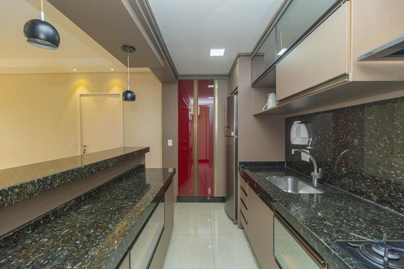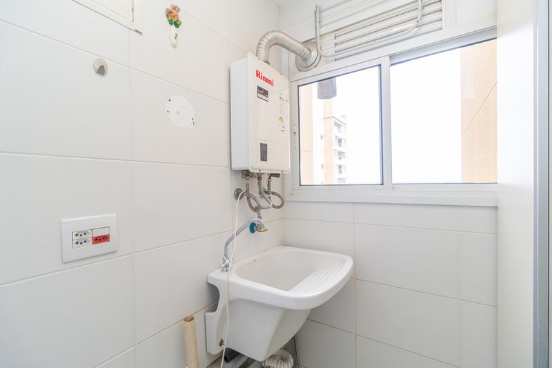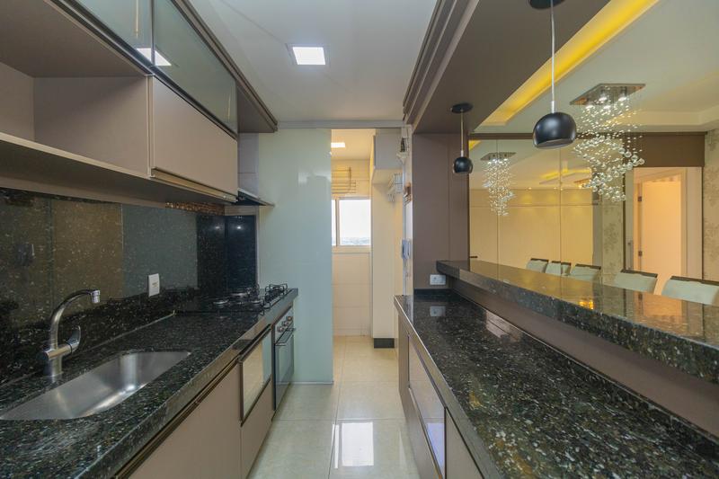 A cozinha em conceito aberto dispõe de armários planejados, geladeira, cooktop, forno e depurador, garantindo funcionalidade no dia a dia. A lavanderia é separada e conta com armário e tanque.