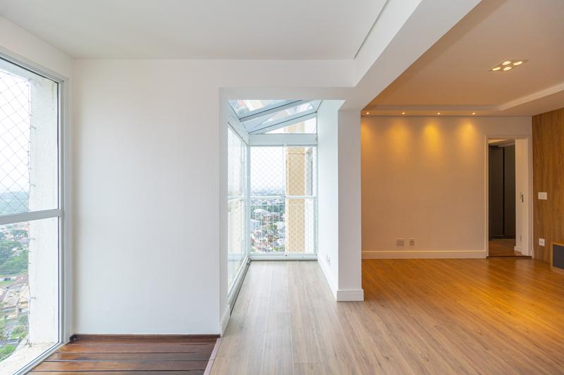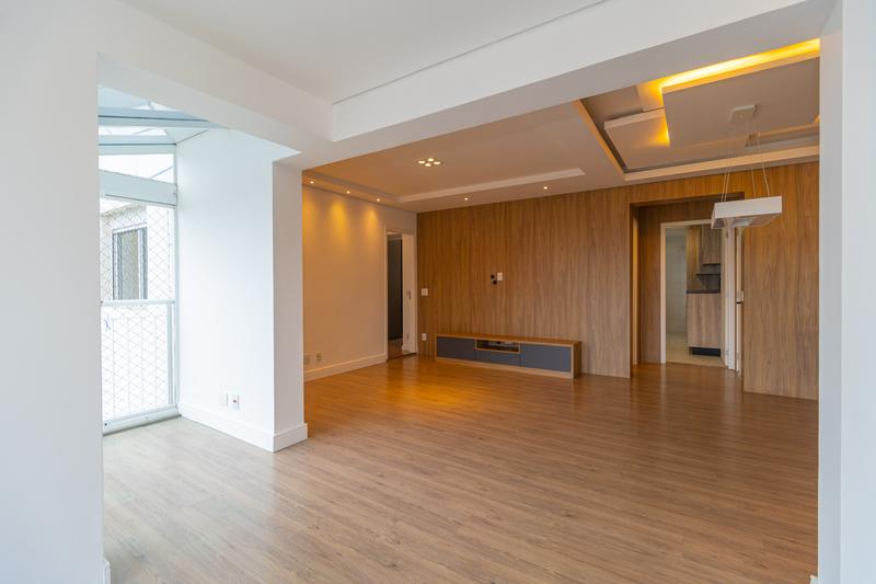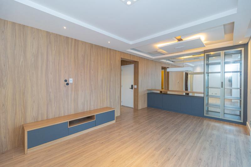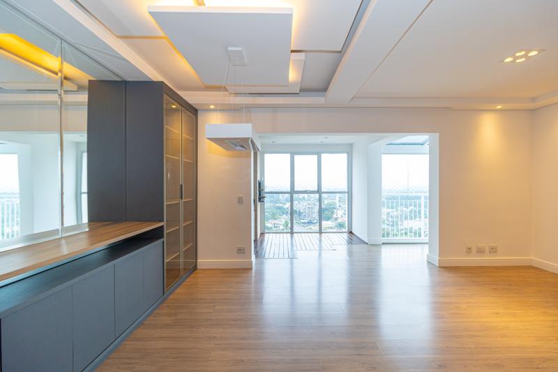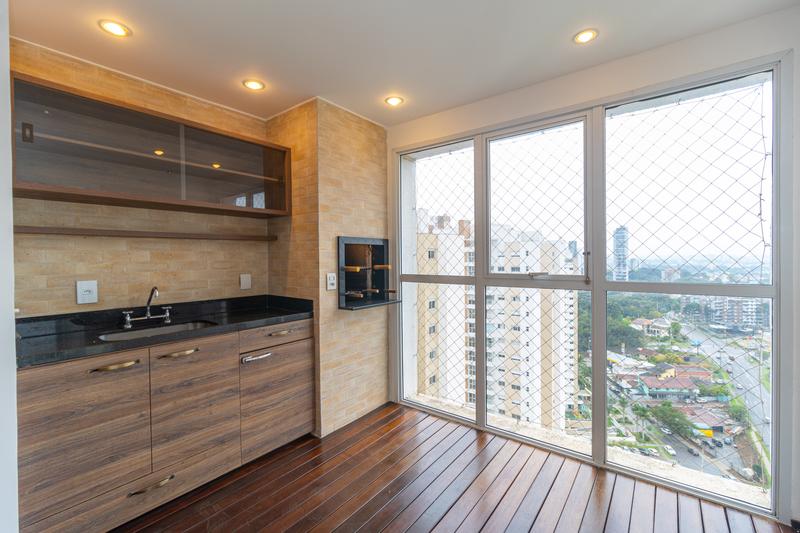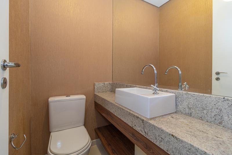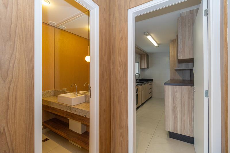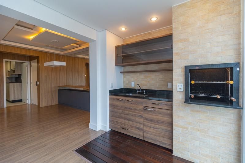 – Sala para 2 ambientes, possui cristaleira, bancada, rack e painel para TV, lavabo, com acesso para varanda integrada e fechamento em vidro, com churrasqueira, armário com frigobar embutido e pia,