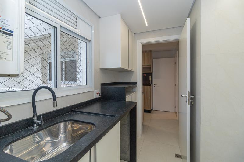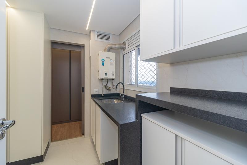 – Lavanderia com armários, tanque, espaço para máquina de lavar com abertura frontal,