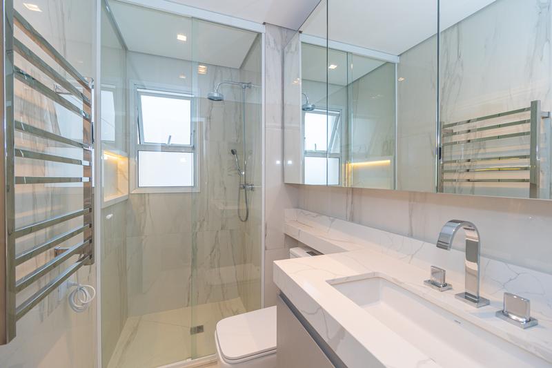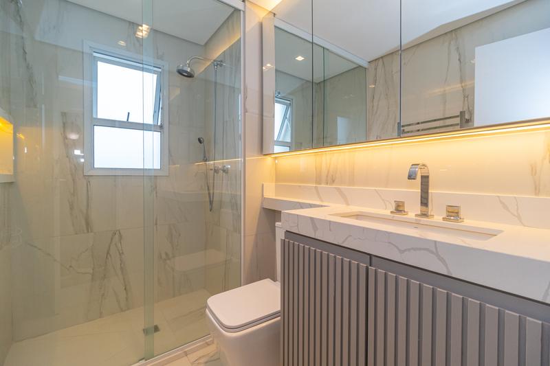 – Banheiro social com armário, espelho e box em blidex com fechamento até o teto,