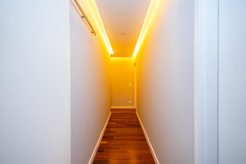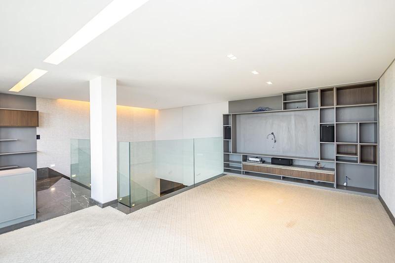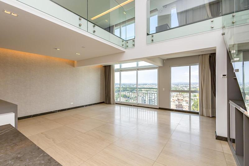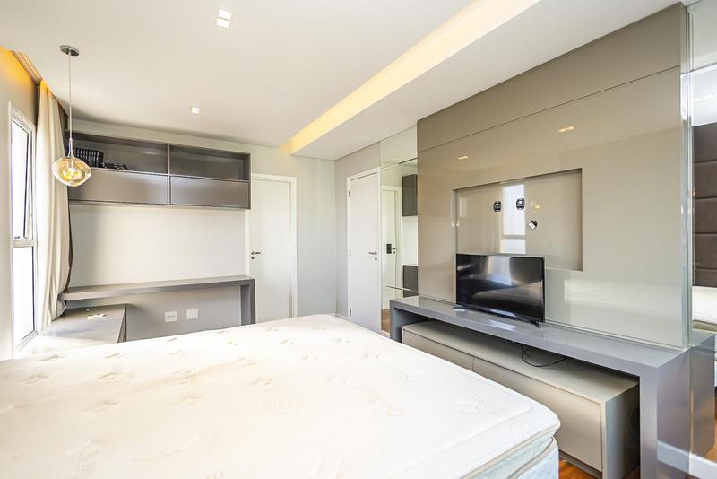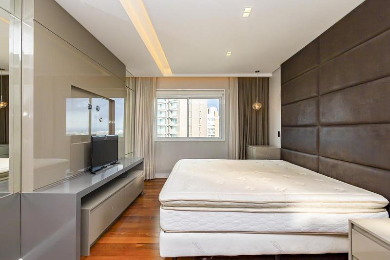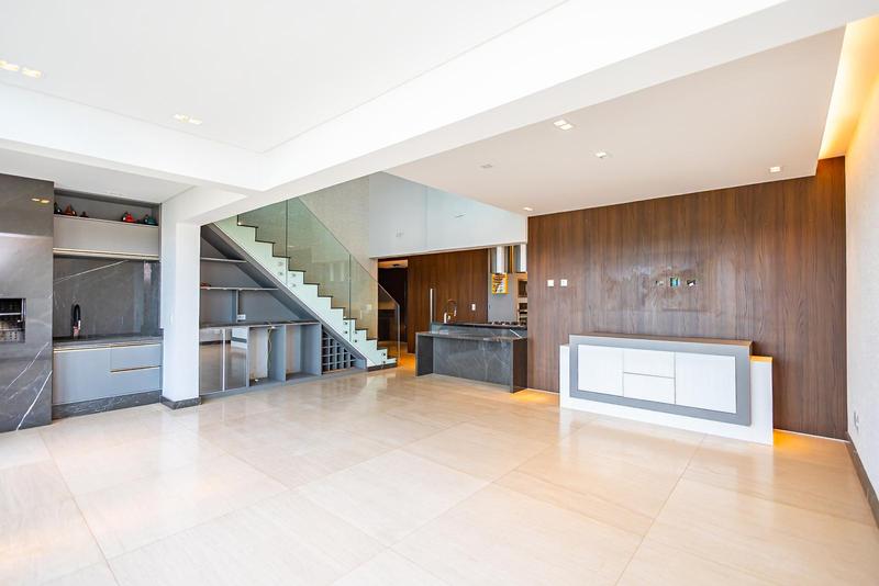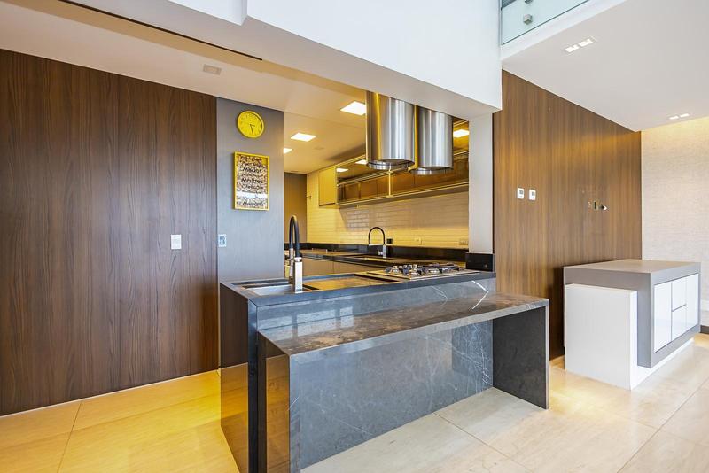 – O grande destaque do apartamento é o pé-direito duplo, que proporciona imponência e excelente iluminação natural, aliado a um mezanino que abriga escritório e sala de TV, trazendo funcionalidade e elegância aos ambientes.