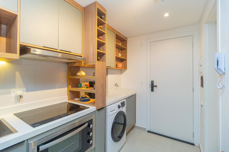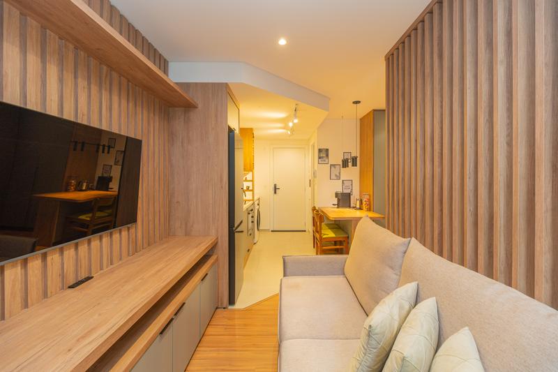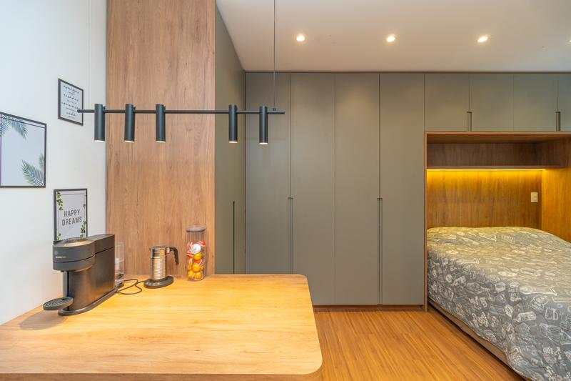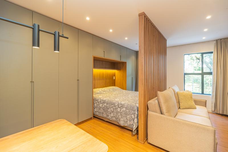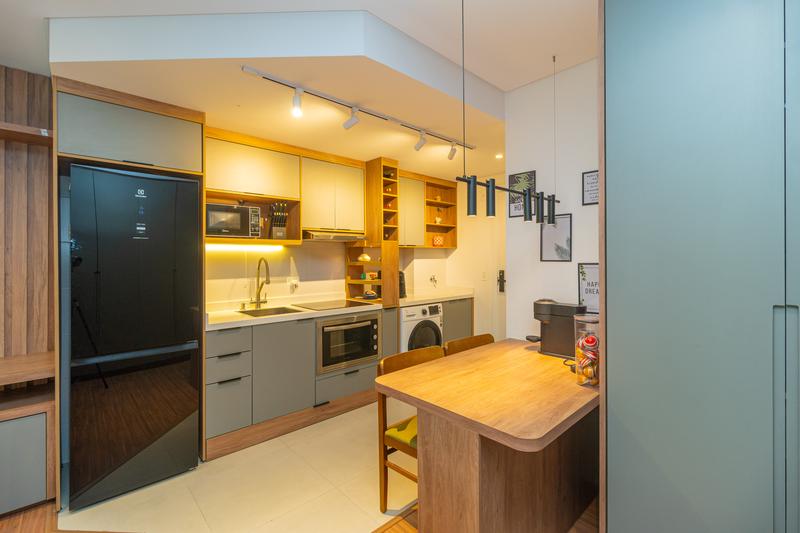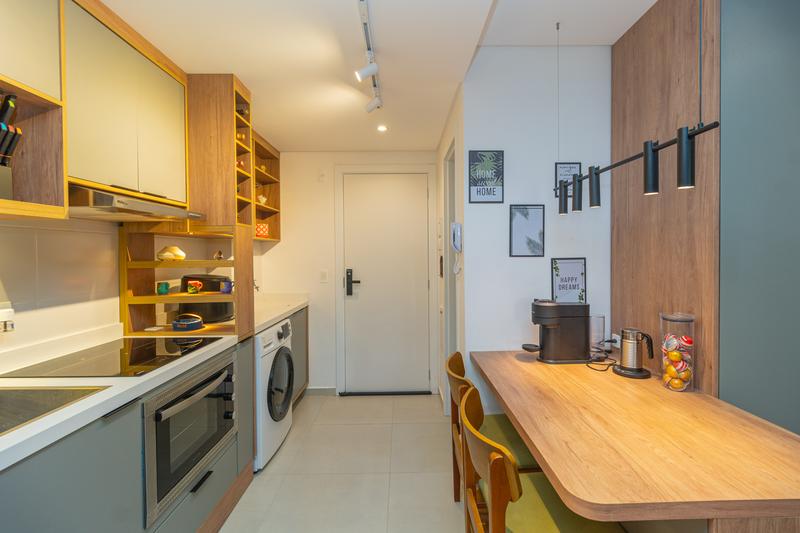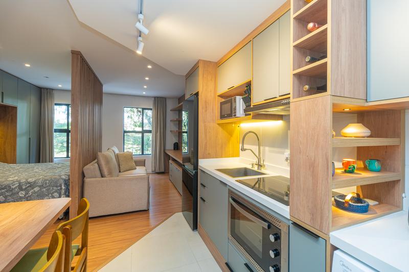 – O studio conta com ambiente integrado, unindo sala, quarto e cozinha de forma funcional e bem distribuída. A cozinha é equipada com armários planejados, geladeira, cooktop de indução, micro-ondas, forno embutido e depurador de ar.