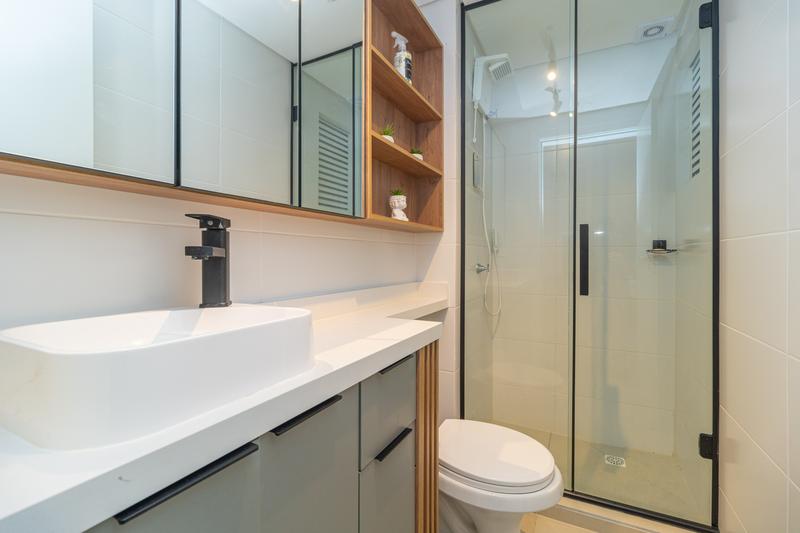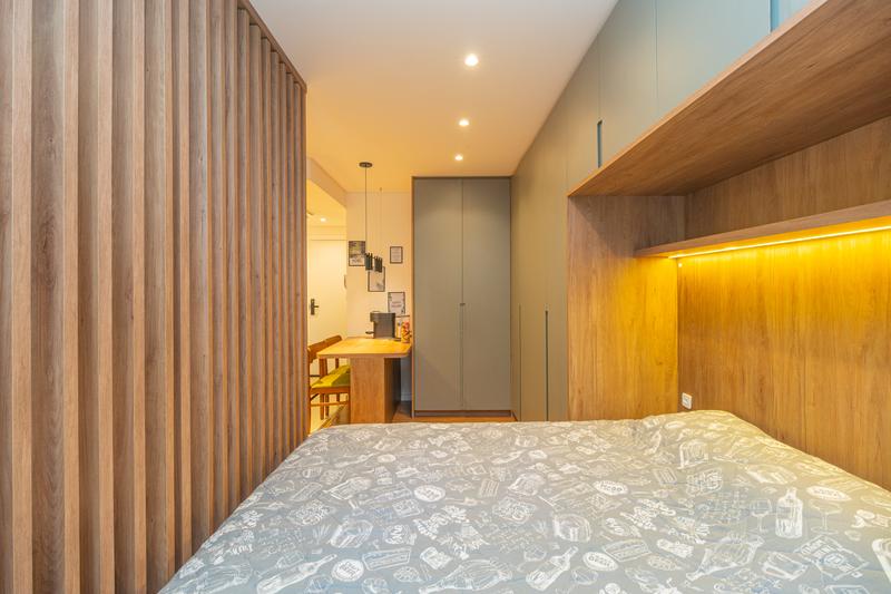 – O dormitório possui cama box queen com baú e armário planejado, garantindo conforto e ótimo aproveitamento de espaço.