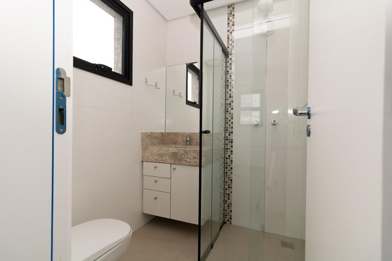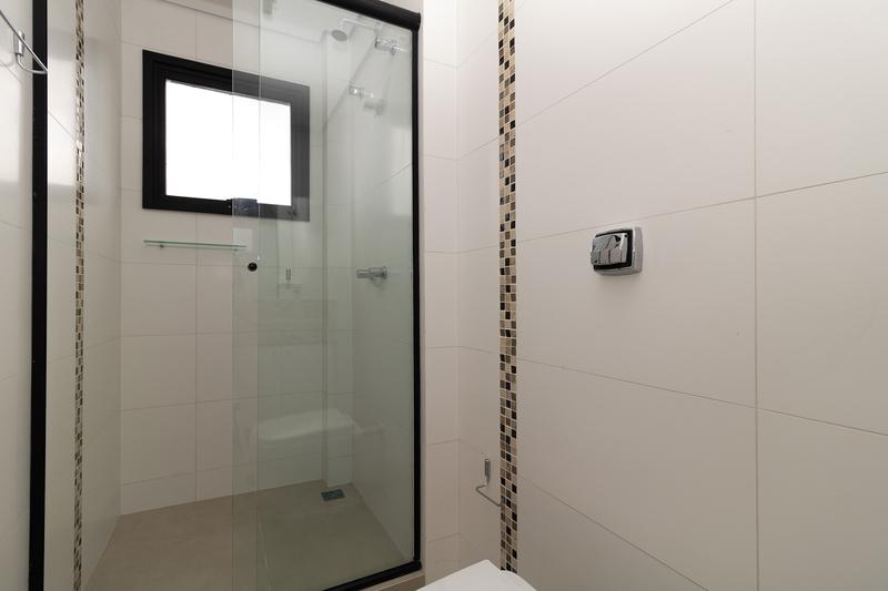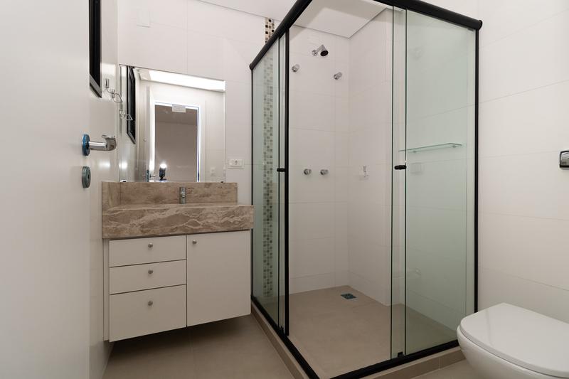 Banheiro social completo, equipado com box, ducha, vaso, pia, espelho e armário.