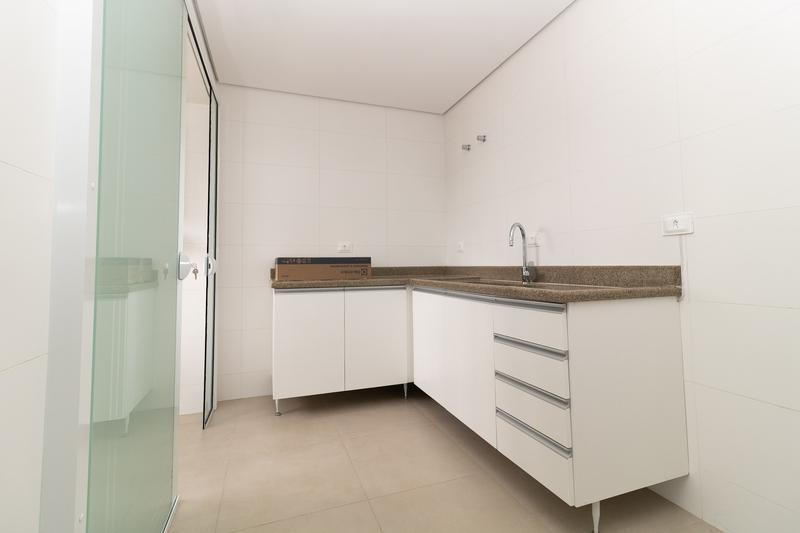 Área de serviço com armário, tanque e espaço para máquina de lavar.