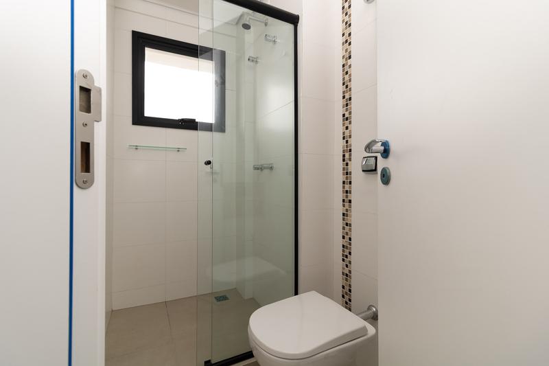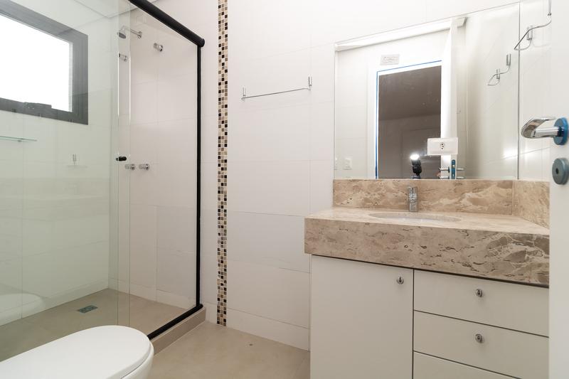 Banheiros social e das suítes com box, vaso, pia, espelho, armário e ducha