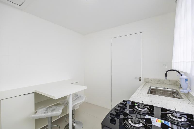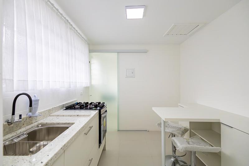 Cozinha planejada, equipada com armários sob medida, mesa, fogão embutido novo e banquetas novas;