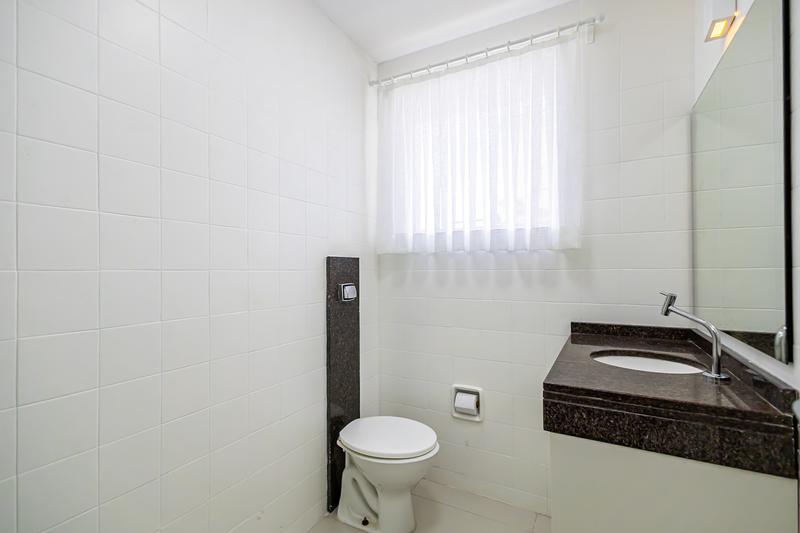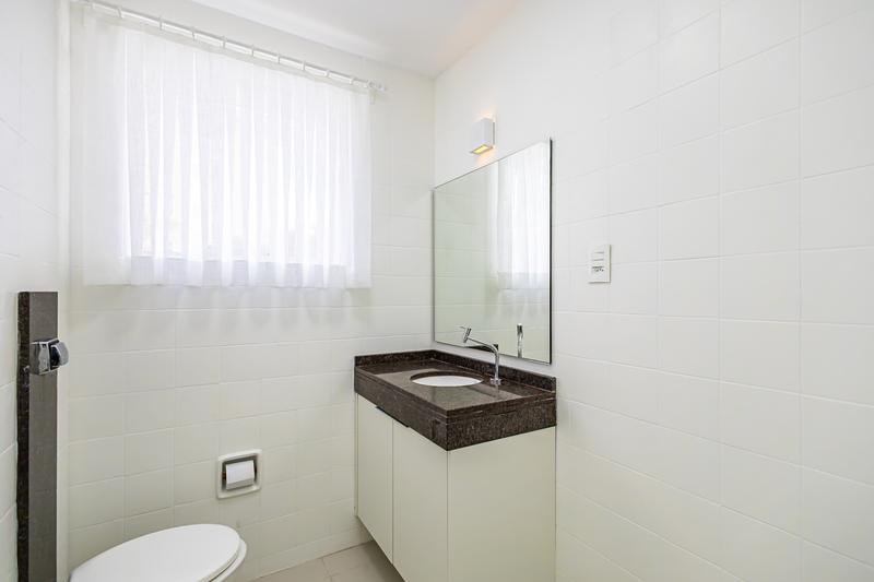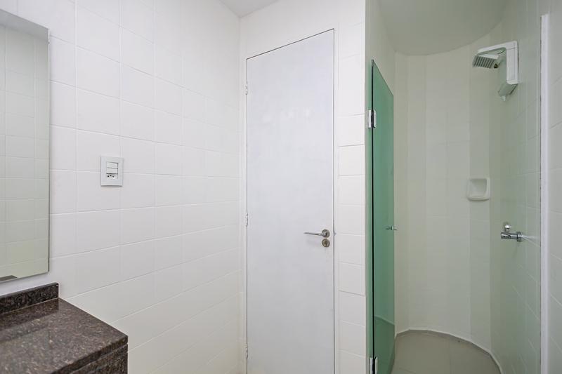 Banheiro social com armário, box em vidro e instalação elétrica nova (220V);