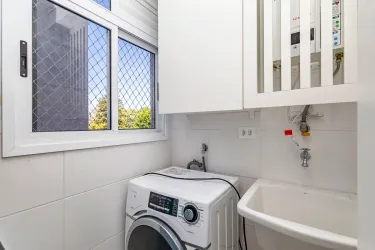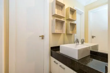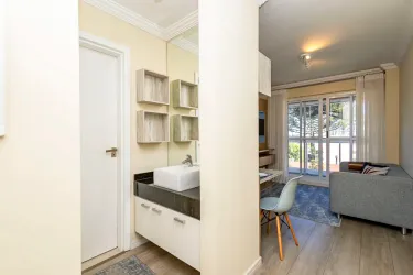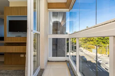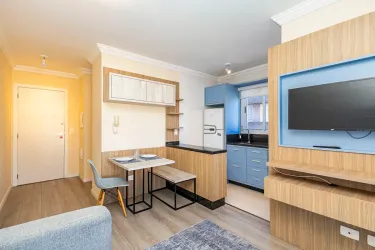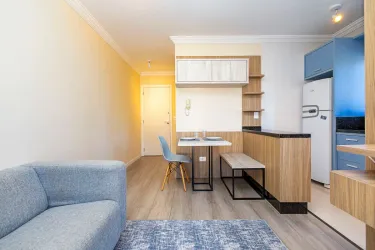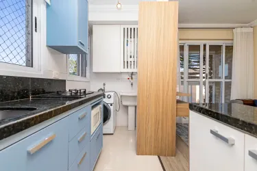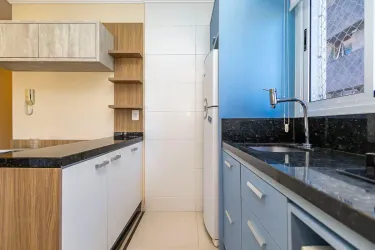 O imóvel está mobiliado e conta com uma sala para dois ambientes, equipada com mesa e cadeiras, painel para TV, sofá e sacada fechada com esquadria de vidro tipo Reiki. A cozinha possui armários planejados, além de eletrodomésticos como fogão, geladeira e micro-ondas, a?ea de serviço com máquina de lavar.