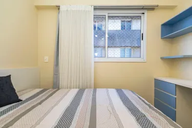 O dormitório é bem iluminado, com armário embutido, bancada para estudos e cama.