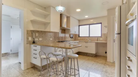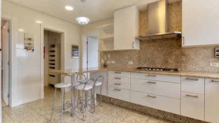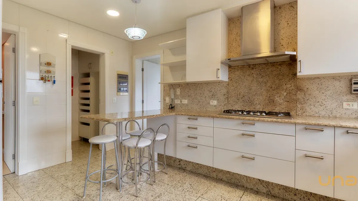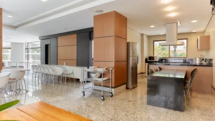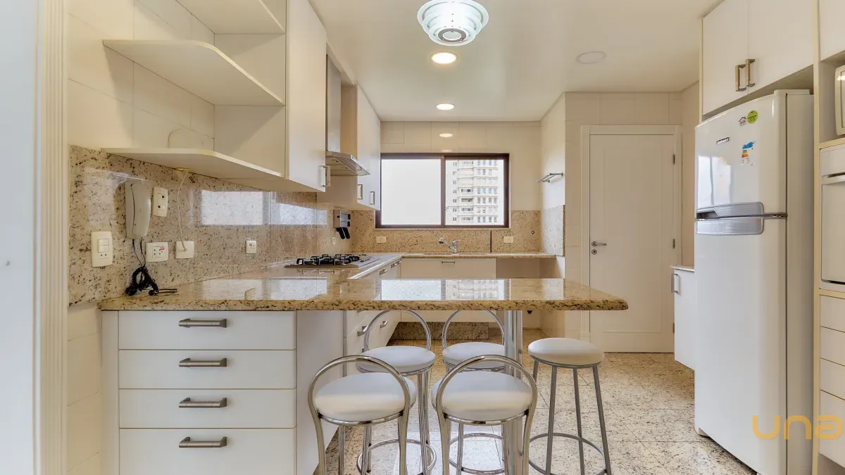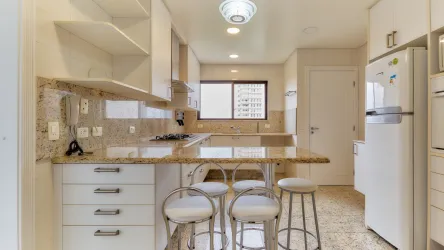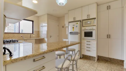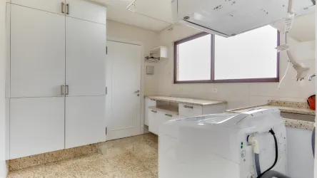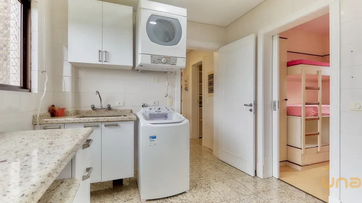 A cozinha planejada é um verdadeiro convite para explorar suas habilidades culinárias. Com armários sob medida e piso em granito, oferece praticidade e elegância em cada detalhe. Já a área de serviço, ampla e bem ventilada, dispõe de dependência completa, garantindo maior comodidade no dia a dia.